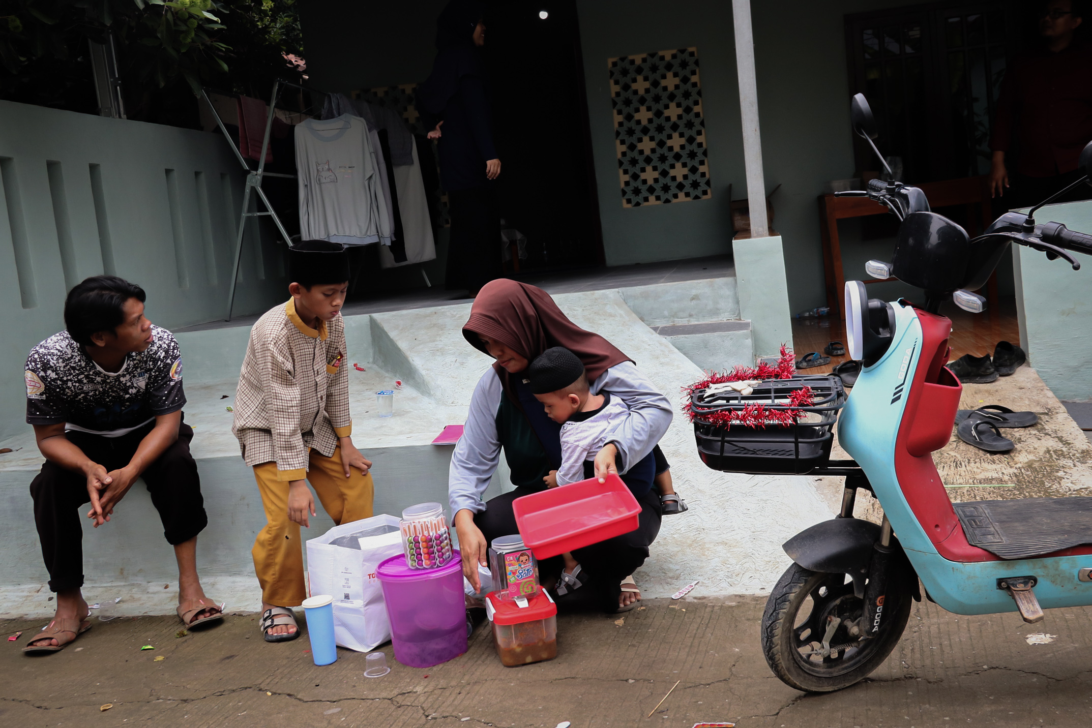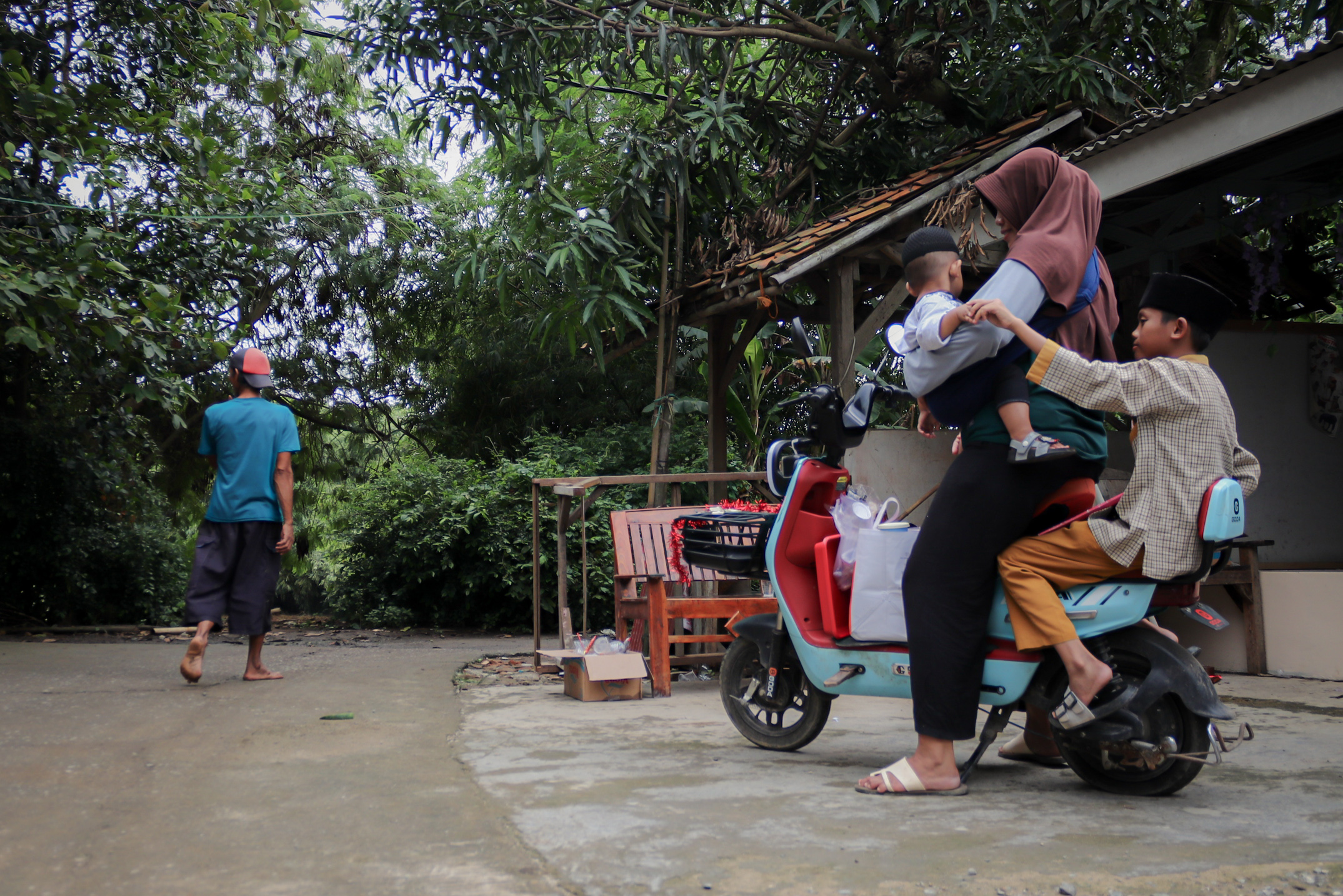 Sepeda listrik Maskah memuat Asbhat di boncengan belakang, sementara ia mengemudi sambil menggendong si bayi. Di sela-sela kakinya sudah bersusun kotak plastik berisi dagangan. Sampai di rumah belajar, Asbhat langsung memilih meja di deretan depan dan Maskah menurunkan dagangan sambil bersiap jualan dan mengaji di samping rumah belajar.