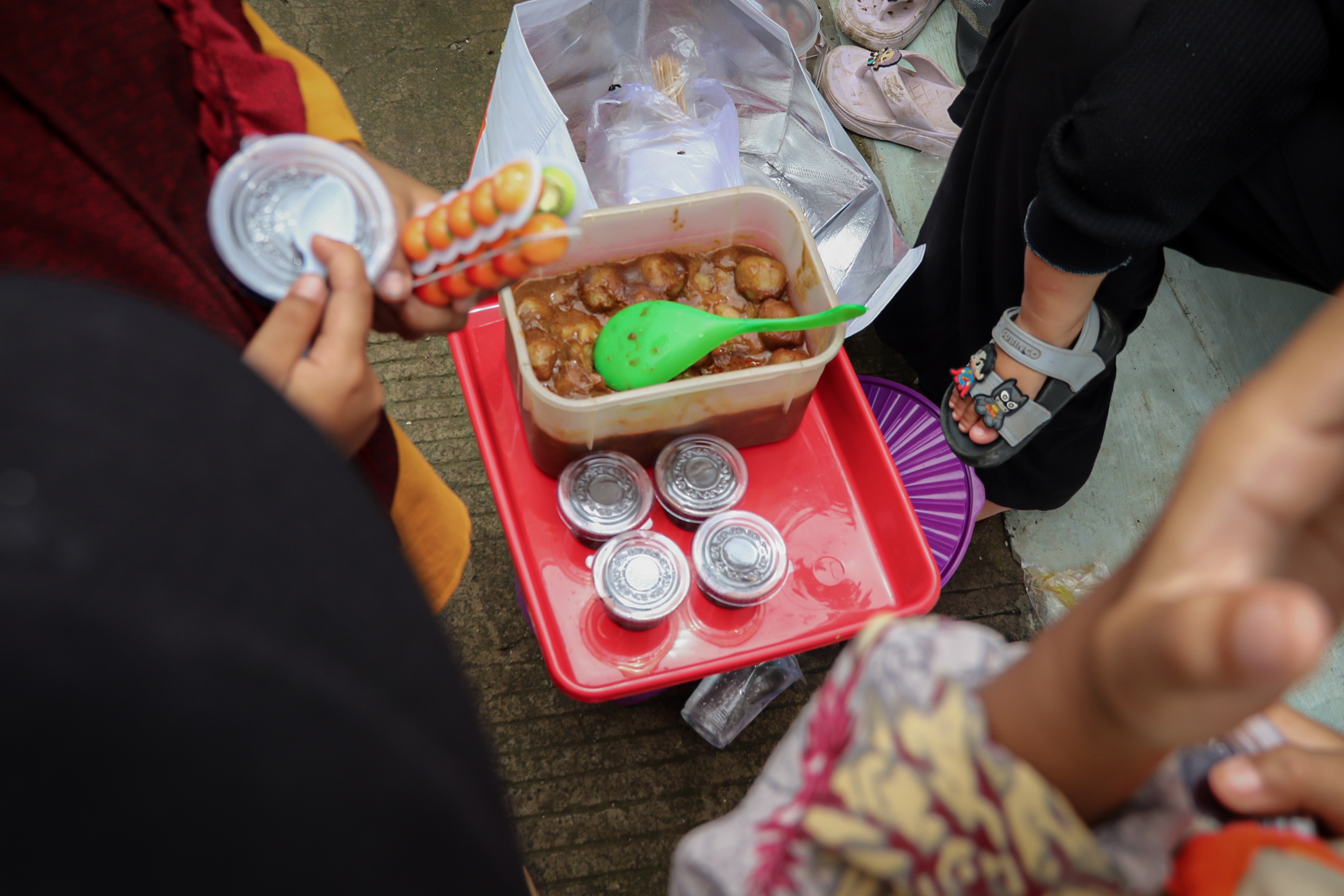 “Iya biar bae,” katanya menyahut cuek sambil menata cilok, puding cokelat, permen jeli, dan es krim cup ke atas sepeda listrik.