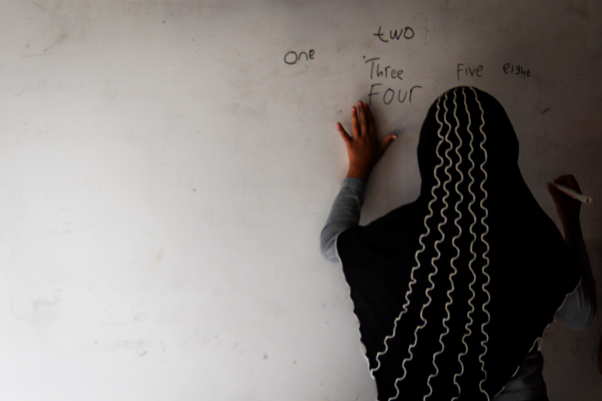 Foto: Seorang siswi menulis di papan tulis saat kelas Bahasa Inggris di Rumah Belajar al-Masroor, Kabupaten Bekasi, Sabtu, (3/1).