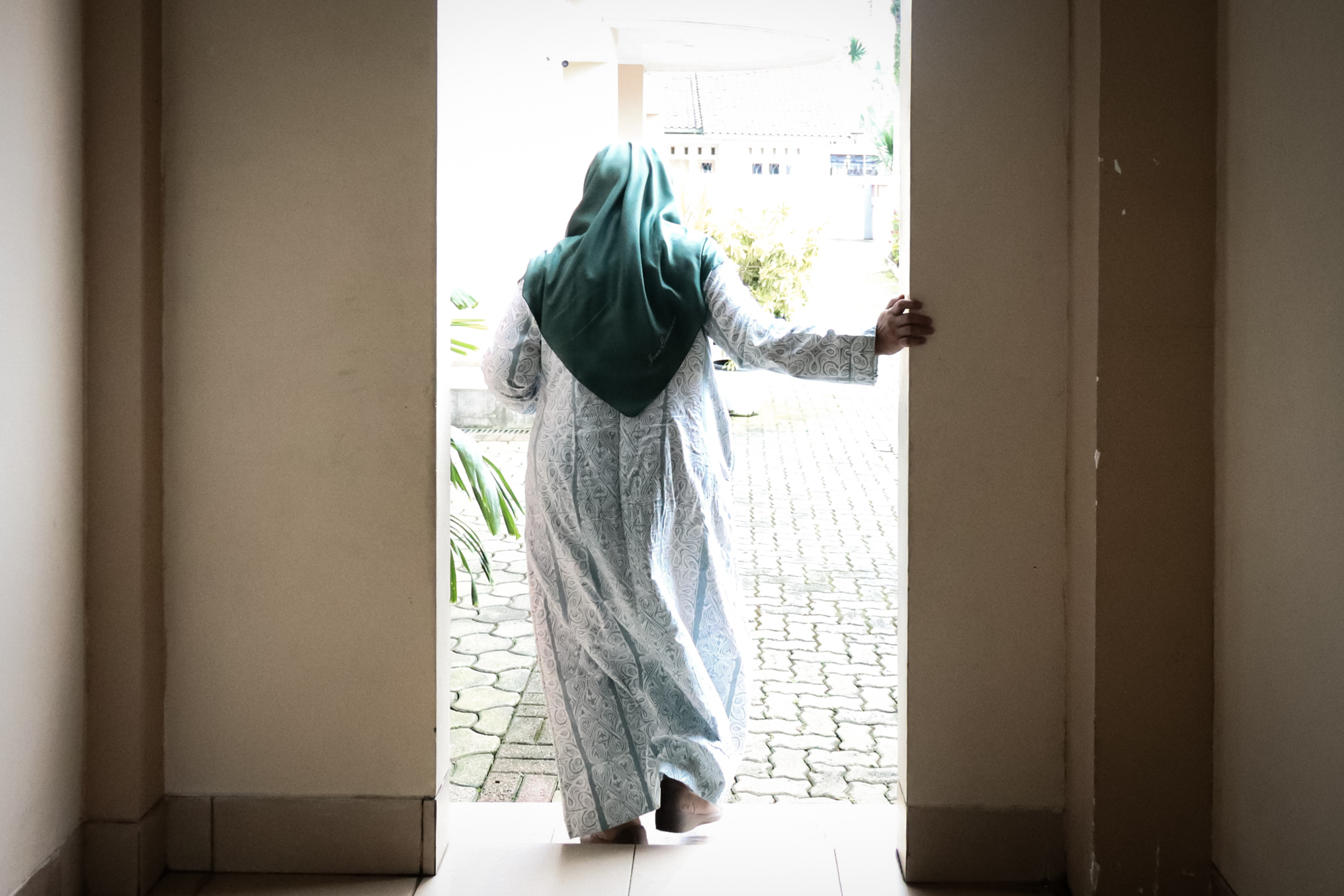 Foto: Sadr Lajnah Imaillah, Lilis Aisyah Bakrie berjalan di area perpustakaan Nusrat Jahan, Kabupaten Bogor, Minggu, (4/1).