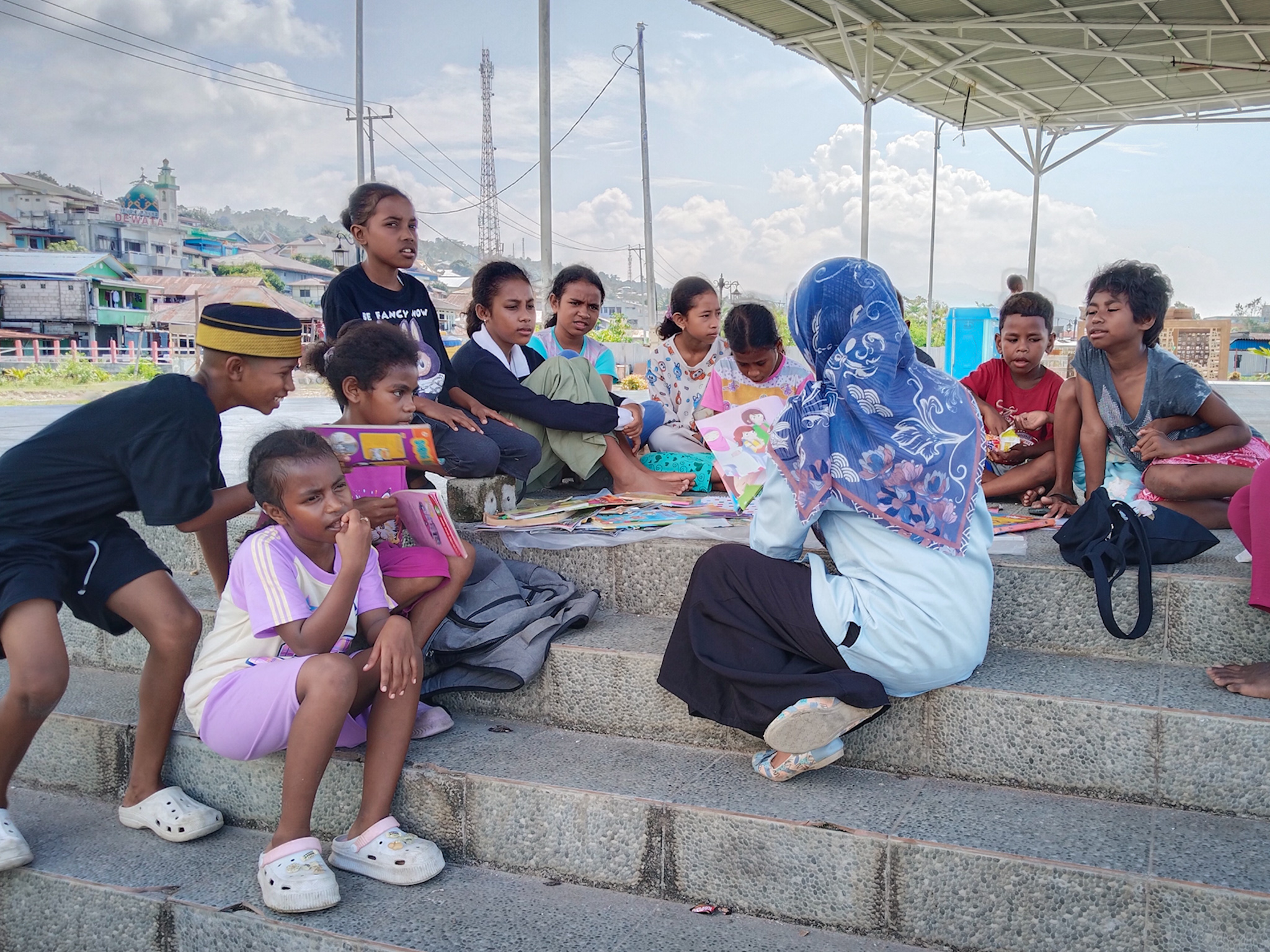 Foto: Mutia Siddiqa (37) membacakan dongeng untuk anak-anak di Rumah Belajar SatuTiBa, Fak-fak, Papua Barat. (Doc: Pribadi)